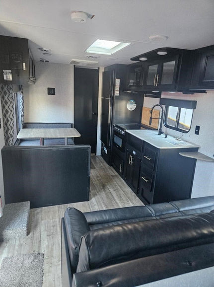 This camper combines modern design with top-tier functionality for the ultimate camping experience. Featuring the Sequoia Decor and Base Camp Package, it’s built to last with a rugged armored underbelly and added protection like a black waste tank flush-out kit. Enjoy outdoor living with an exterior folding assist handle, hot and cold outdoor shower, power awning, and RV grill quick connect for those cozy evenings. Inside, you'll find a sleek entertainment system, residential kitchen suite, and high-efficiency 12V lighting. With a stable step system, premium blackout zebra blinds, and plush Teddy Bear bunk mats, comfort is guaranteed. Supplemental rental agreement required and will be emailed upon booking.