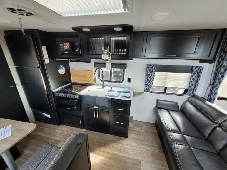 This camper features a fantastic outdoor kitchen, perfect for enjoying a dinner under the stars.